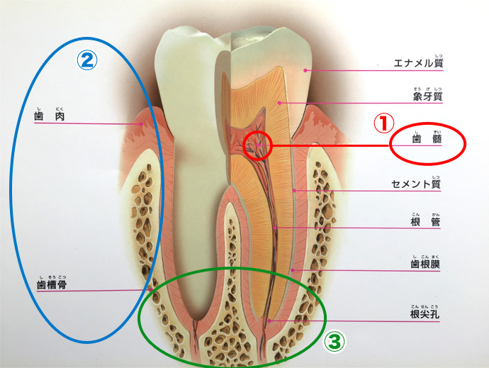 ①虫歯によって歯の神経(歯髄)が炎症を起こしている。