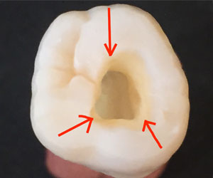 奥歯の根は2~3本あり、1つの根に1~2本の神経があります。人それぞれ(又は人種により)解剖学的な変化があり、ひとつとして同じものはありません。見えるところを更に探りながら奥に進みます。