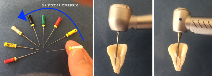 ④歯の根の長さに合わせて、神経の穴をたくさんの道具を使って、少しずつ確実に大きくしながら神経を取っていきます。