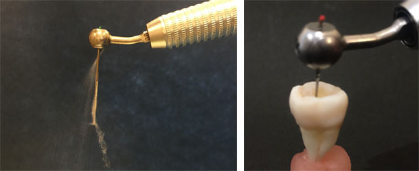 ①歯の噛み合わせ面から穴を開け、神経を見つけます。同時に反対の歯とぶつからないように歯を低く削ります。