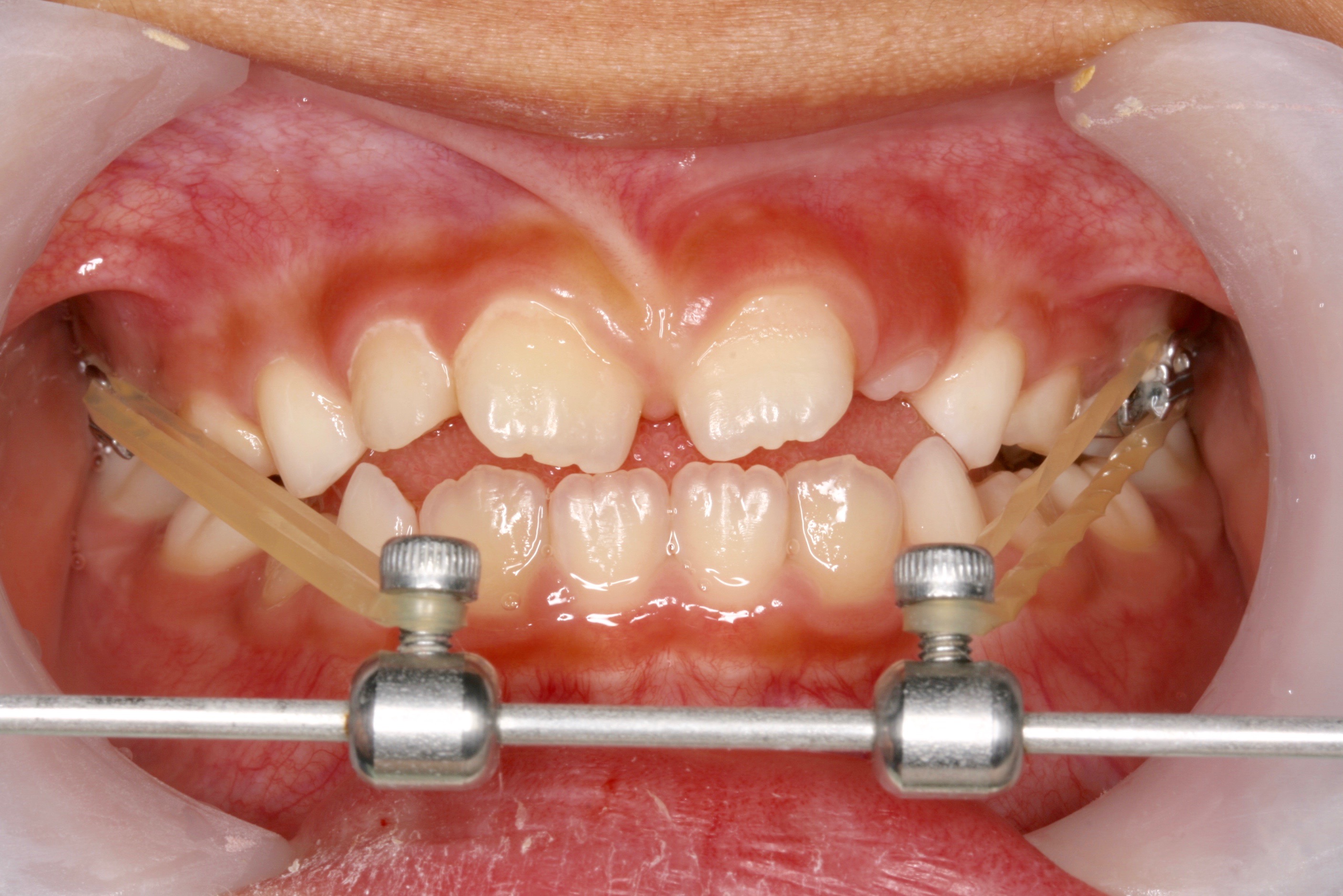 そこで、上の6歳臼歯に装置をつけて、ヘッドギアで後方に引っ張ります。前歯を後方に移動させるスペースを作ることができるだけでなく、下アゴの成長を促進させることができます。