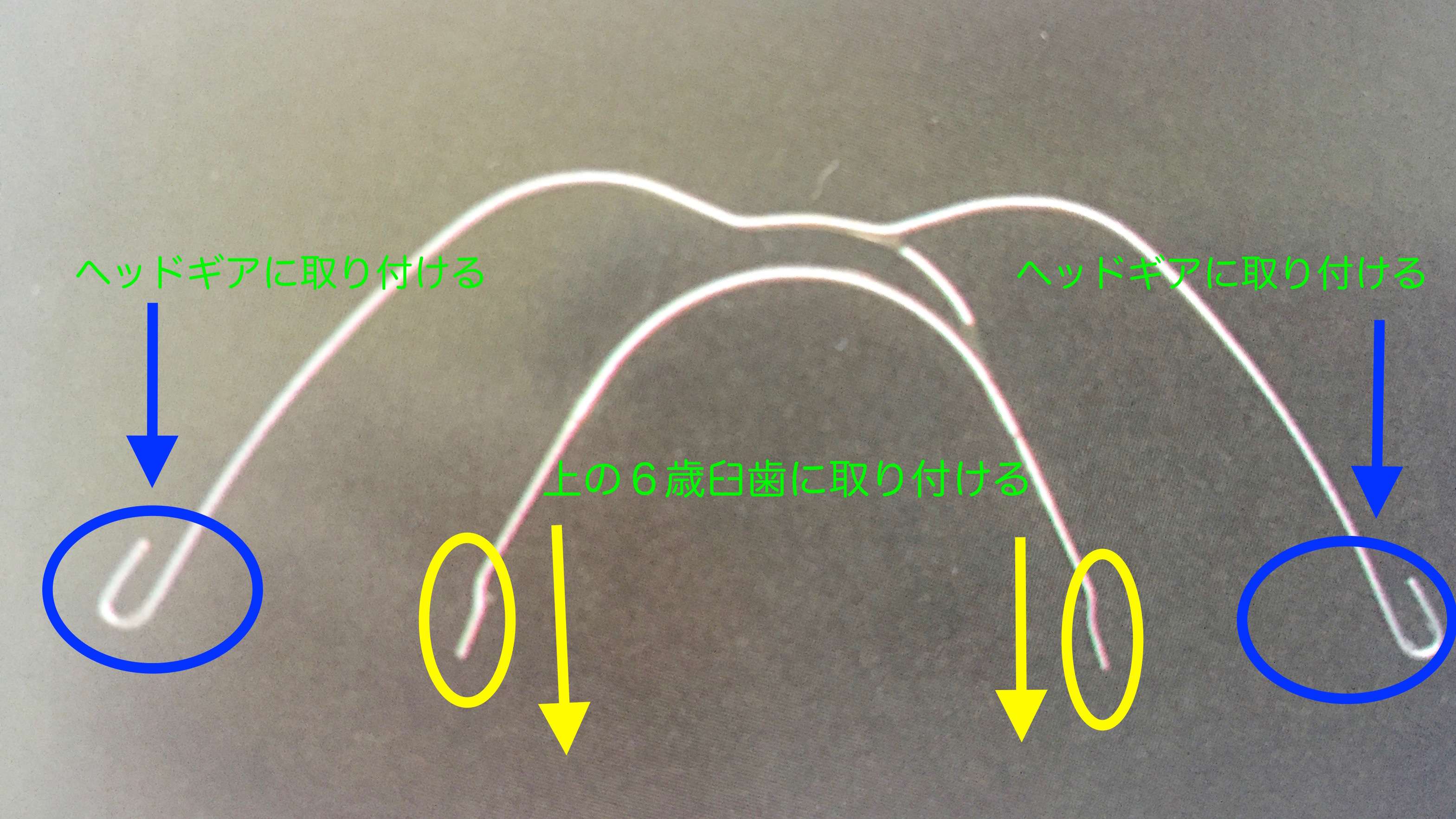この針金は、6歳臼歯とヘッドギアをつなぐ装置です。