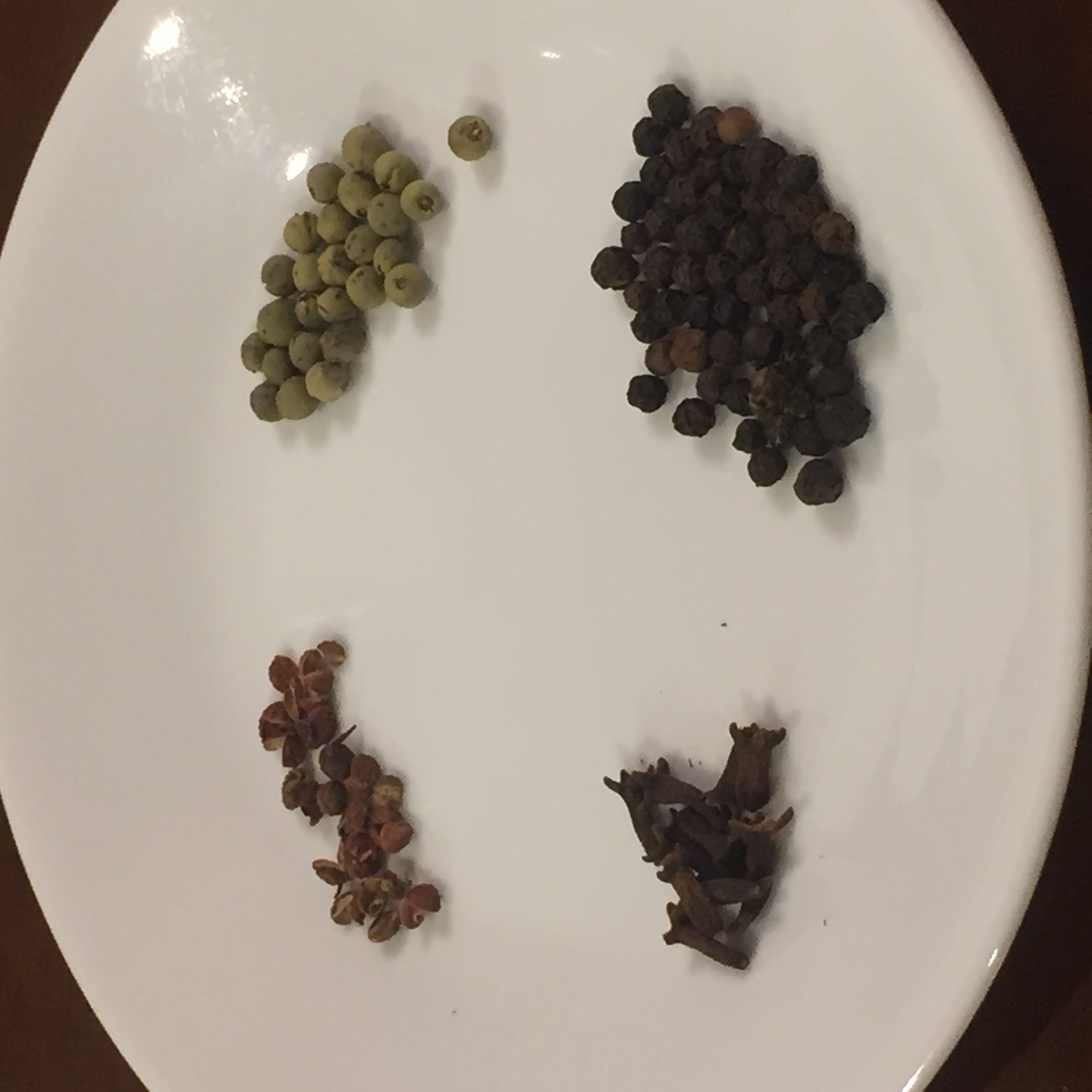 左上から時計回りに、花椒・グリーンペッパー・ブラックペッパー・クローブ