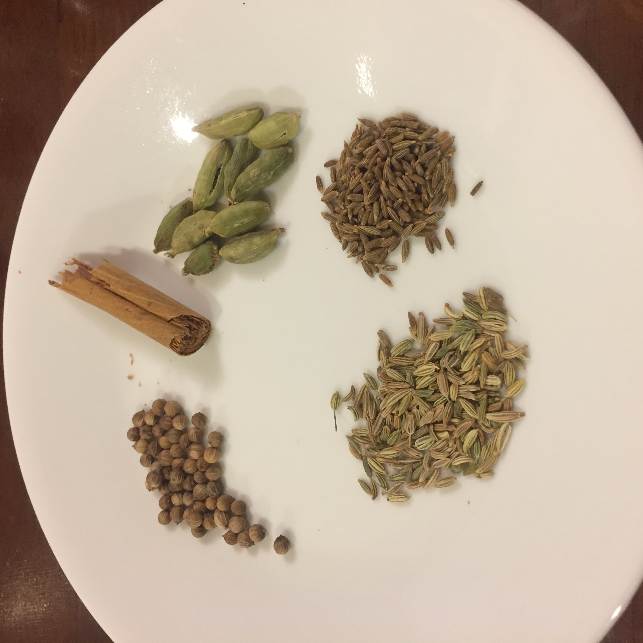 左上から時計回りに、コリアンダー・シナモン・カルダモン・クミン・フェンネル
