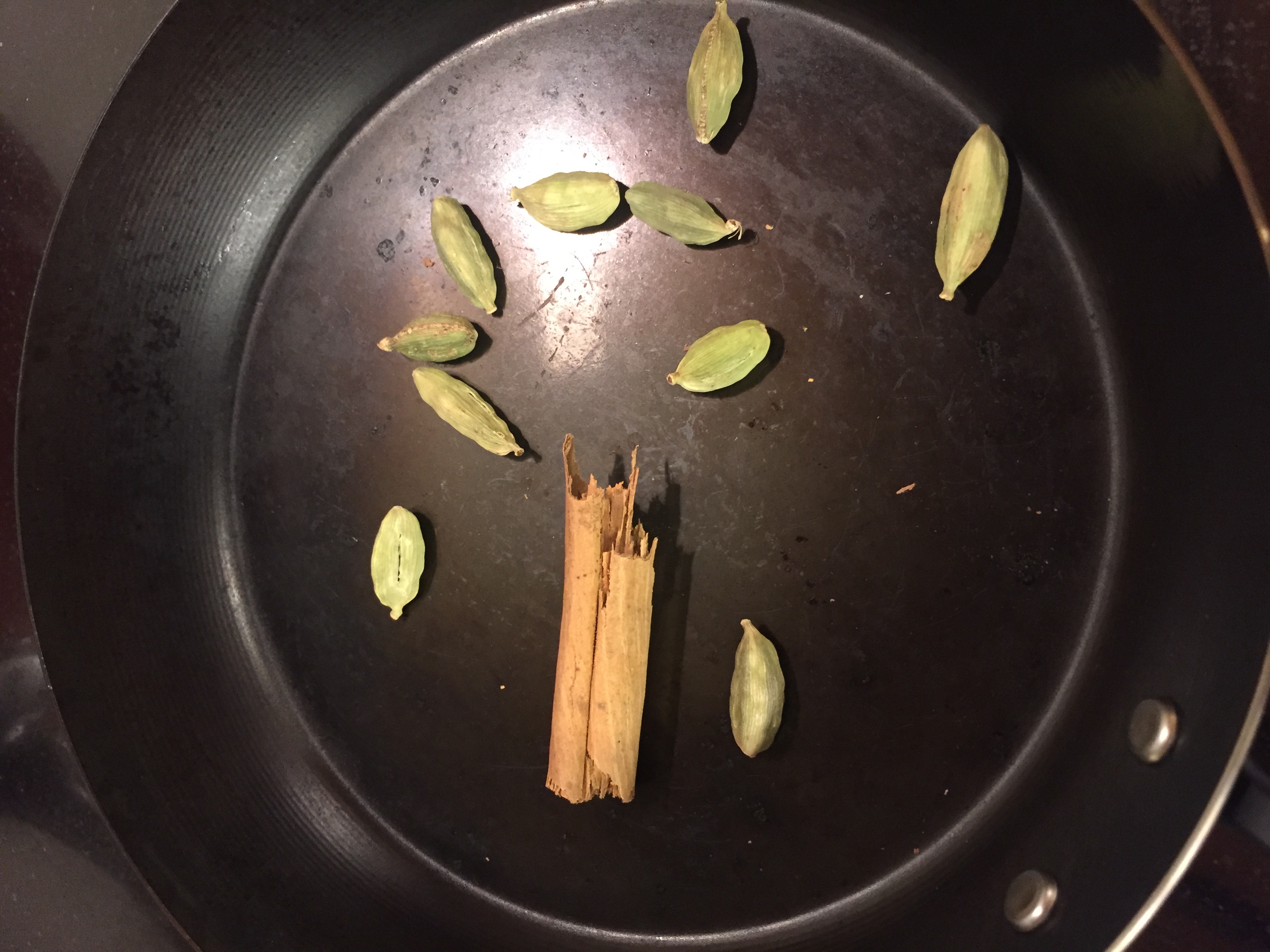 まず、シナモンスティックとカルダモンを炒ってから取り出します。