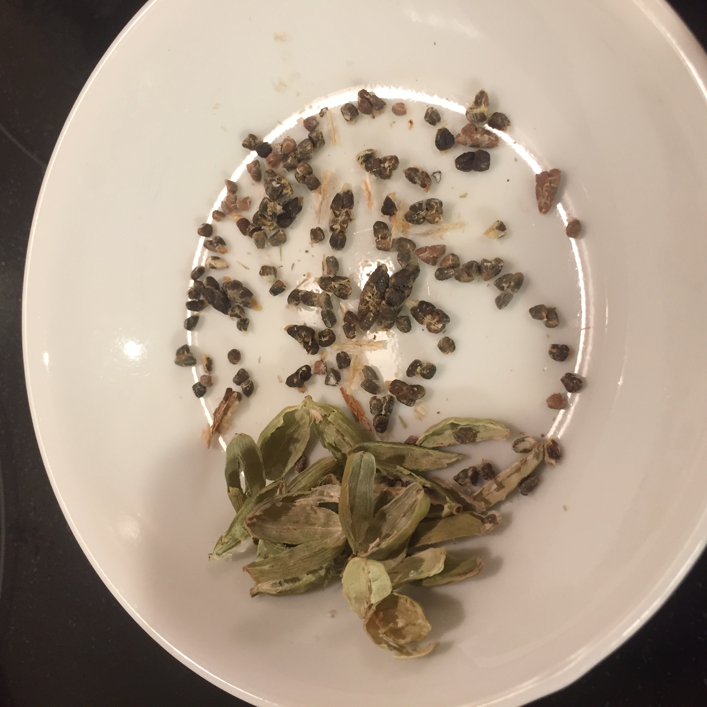 カルダモンの外側の皮を取り除いてください。黒い種だけを使います。