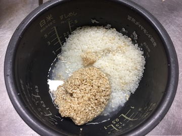 白米2合を研いてから、発芽玄米を1合加えて少なめの水3合で電気釜のスイッチを入れ炊きます。