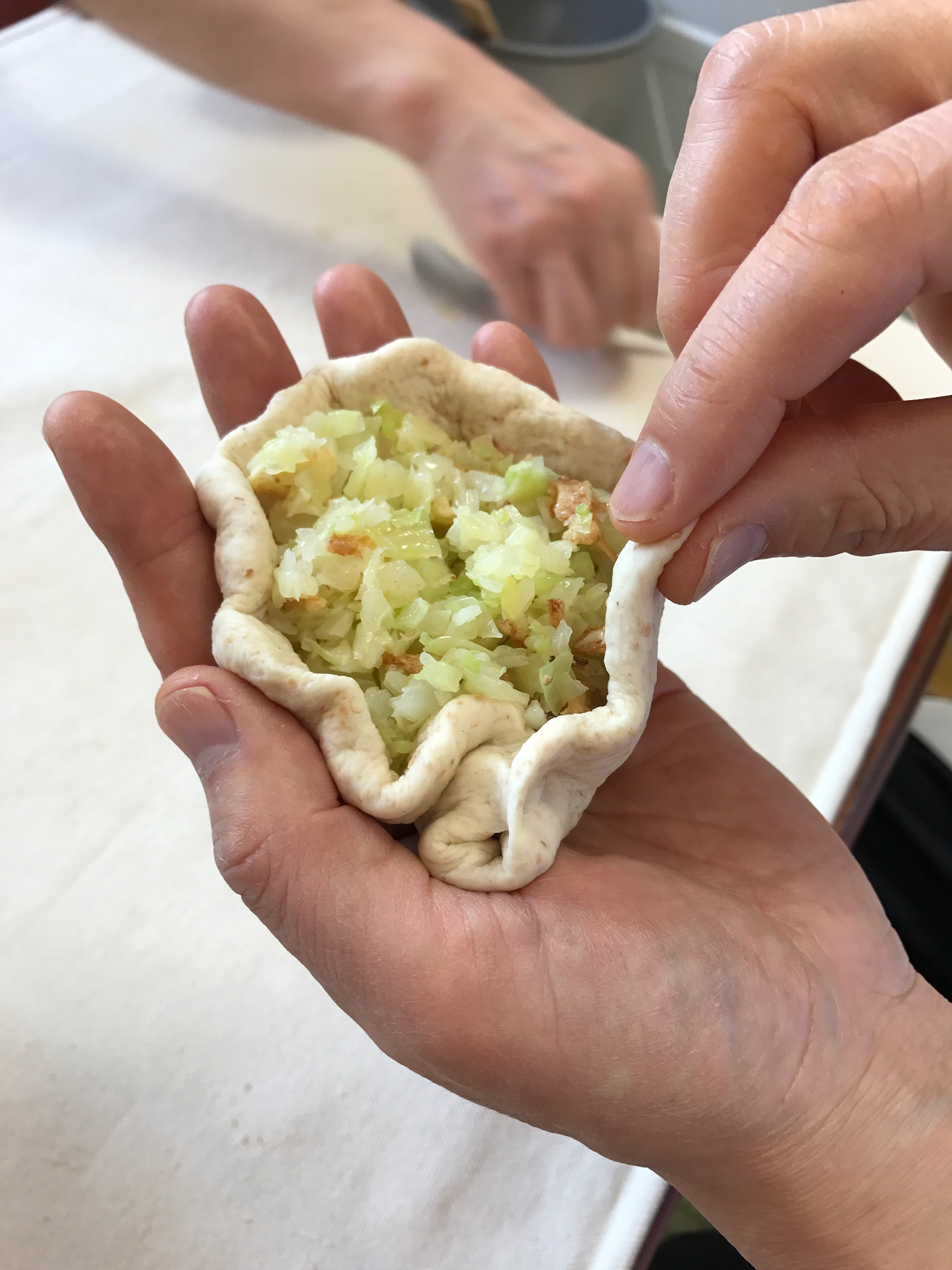 ⑥先ほど作った餡の1/8を生地にのせてひだを作りながら閉じていく。