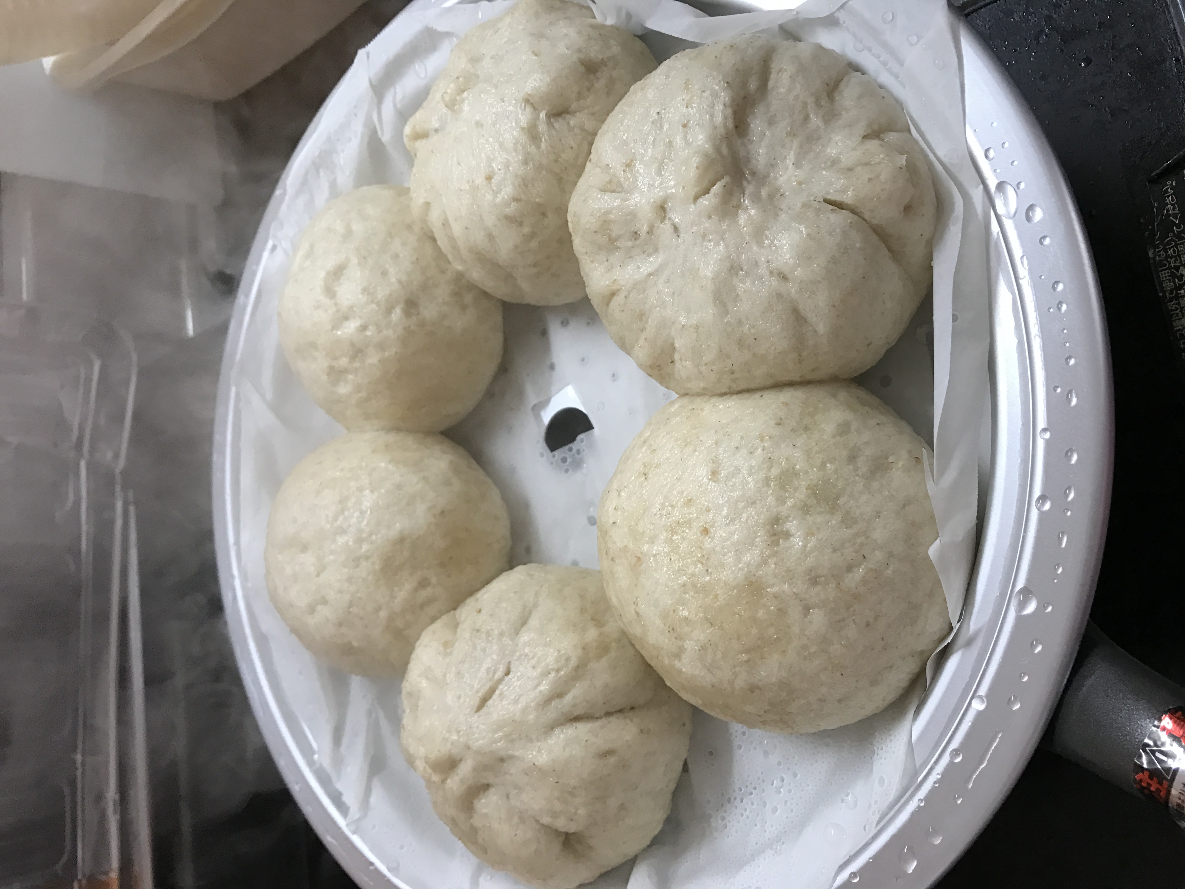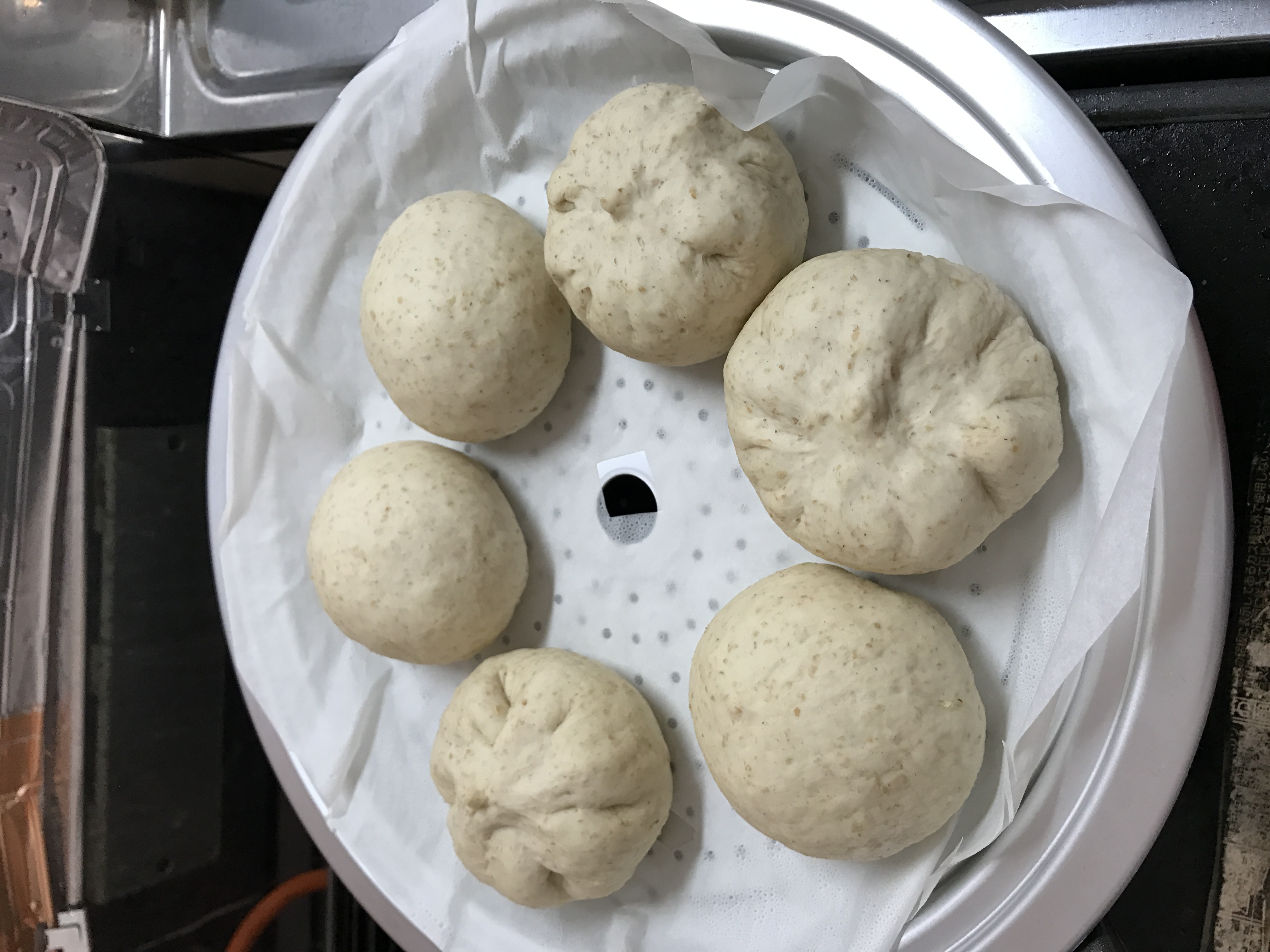 ⑦蒸し器にクッキングシートを敷いて、中華まんを並べる。