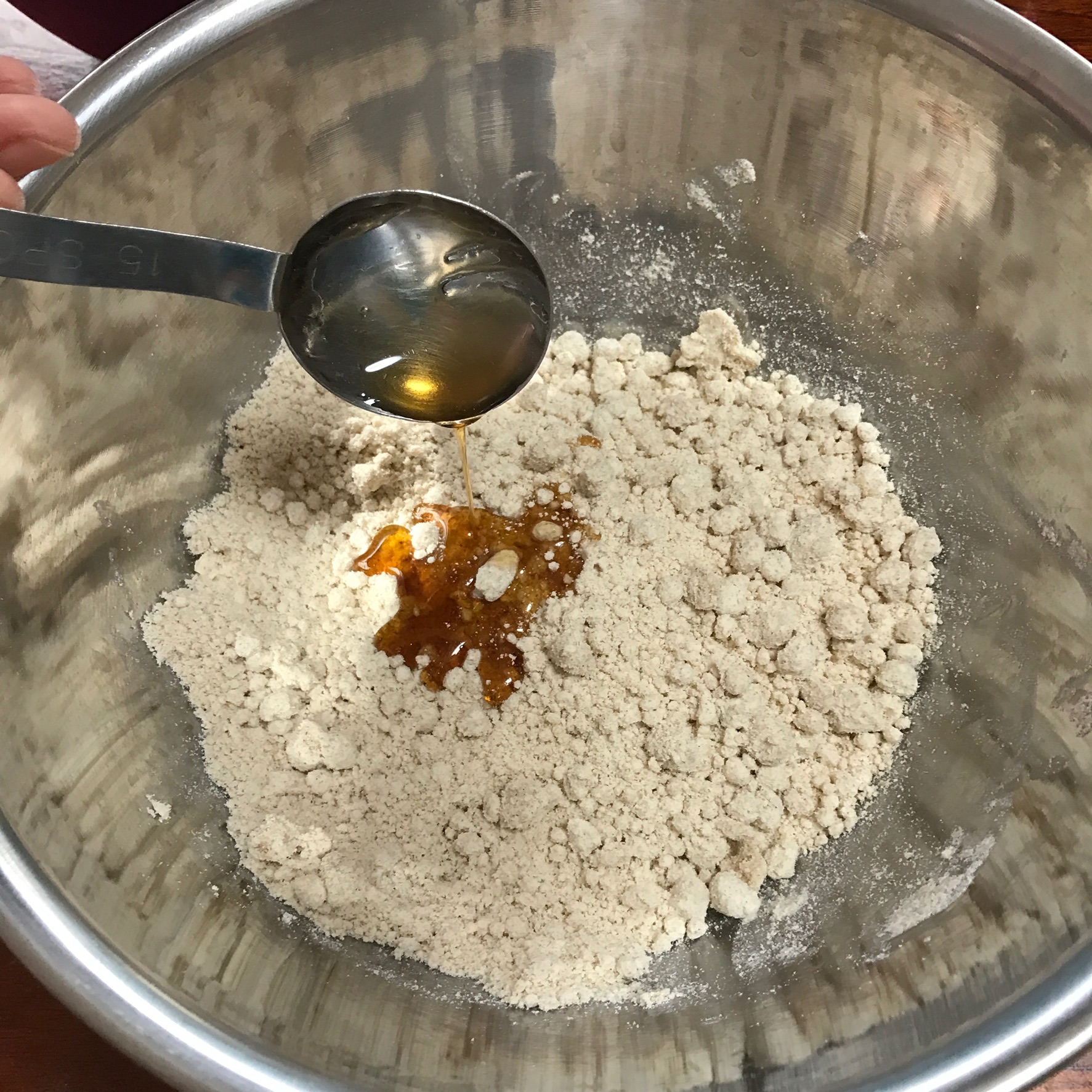 ②菜種油を加え、油に粉をなじませるようにして、手でぐるぐるっと混ぜる。