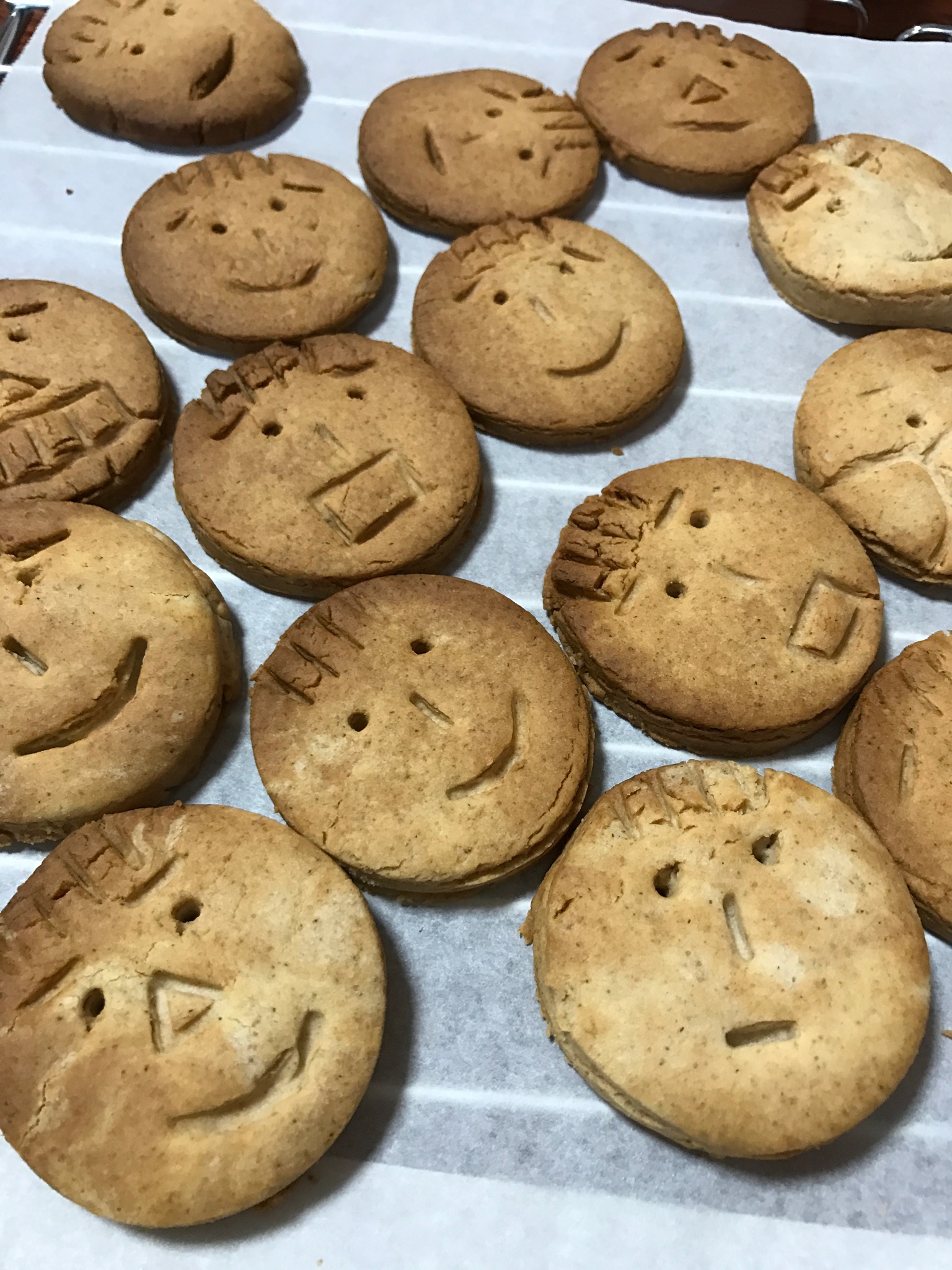 直径5㎝の丸型で抜き天板に間隔をあけて並べ、竹串で目を、スプーンの先やフォークの柄で鼻や口を描く。